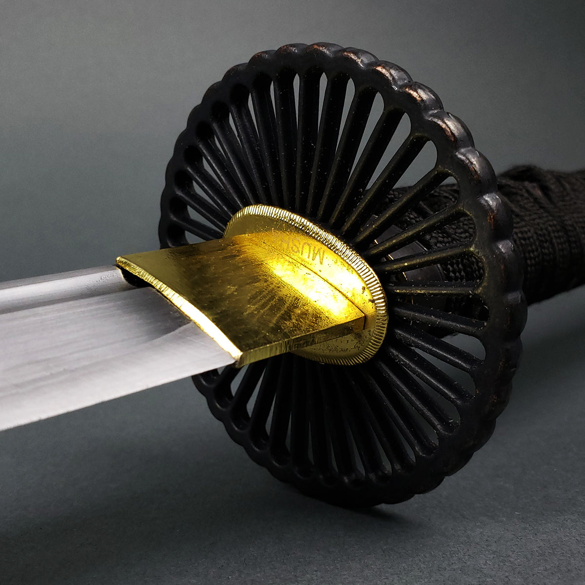 All Musha swords are able to be fully disassembled. Kiku Gata style Tsuba, Fuchi, and Kashira all can be swapped out for a different set. Real wood handle is wrapped with traditional cotton.