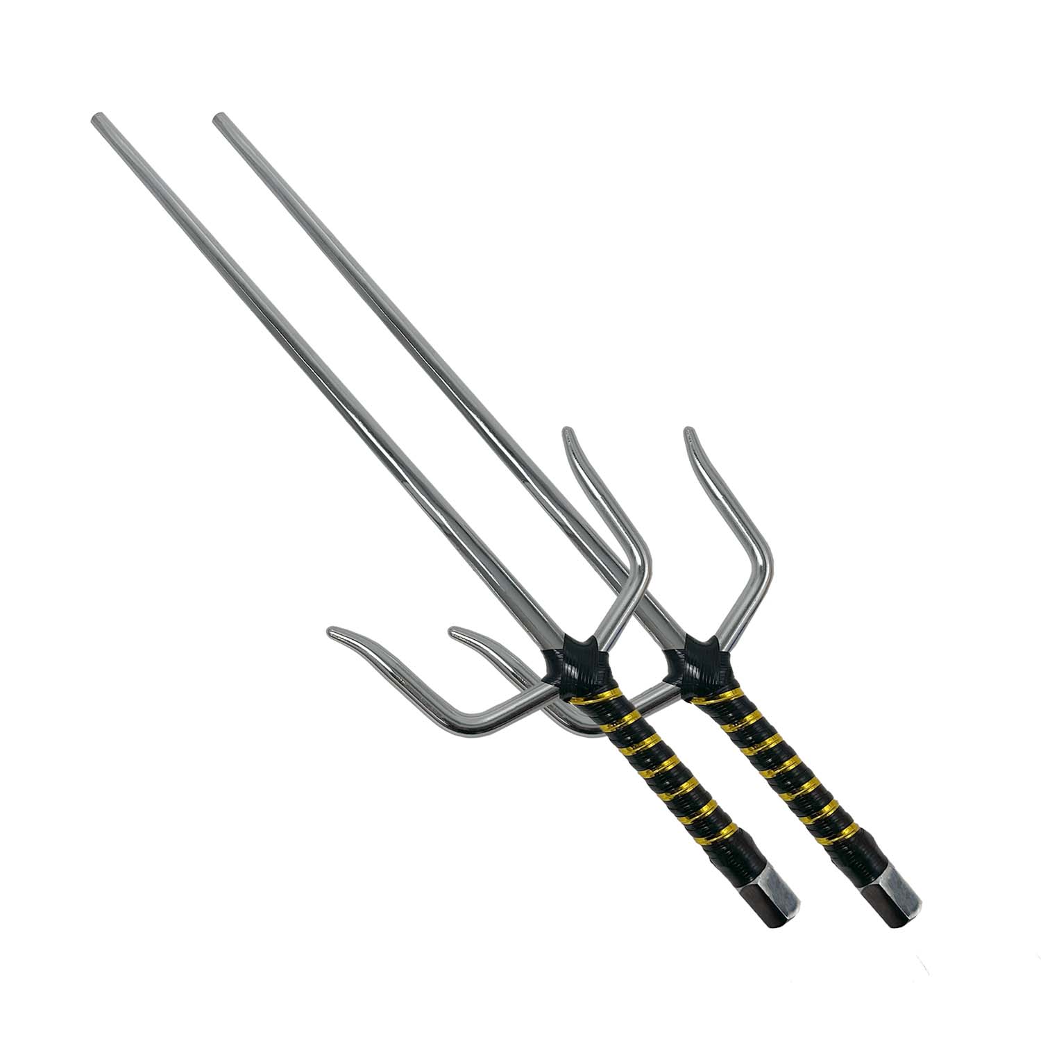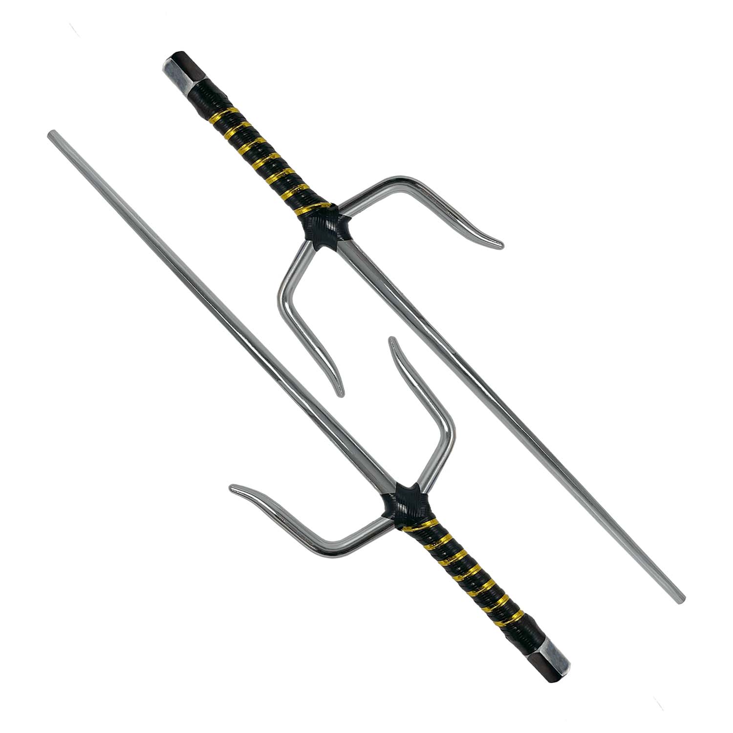 This 21" Chrome Sai features a sleek black gold plastic-wrapped handle for a secure and comfortable grip. Its durable chrome finish ensures long-lasting strength and a striking appearance, making it an excellent choice for both practice and display. Elevate your martial arts collection with this stylish and reliable sai.