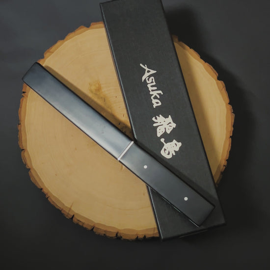 - Blade: Full tang 420 stainless steel blade in tanto style, featuring a Damascus pattern and Asuka logo engraving.