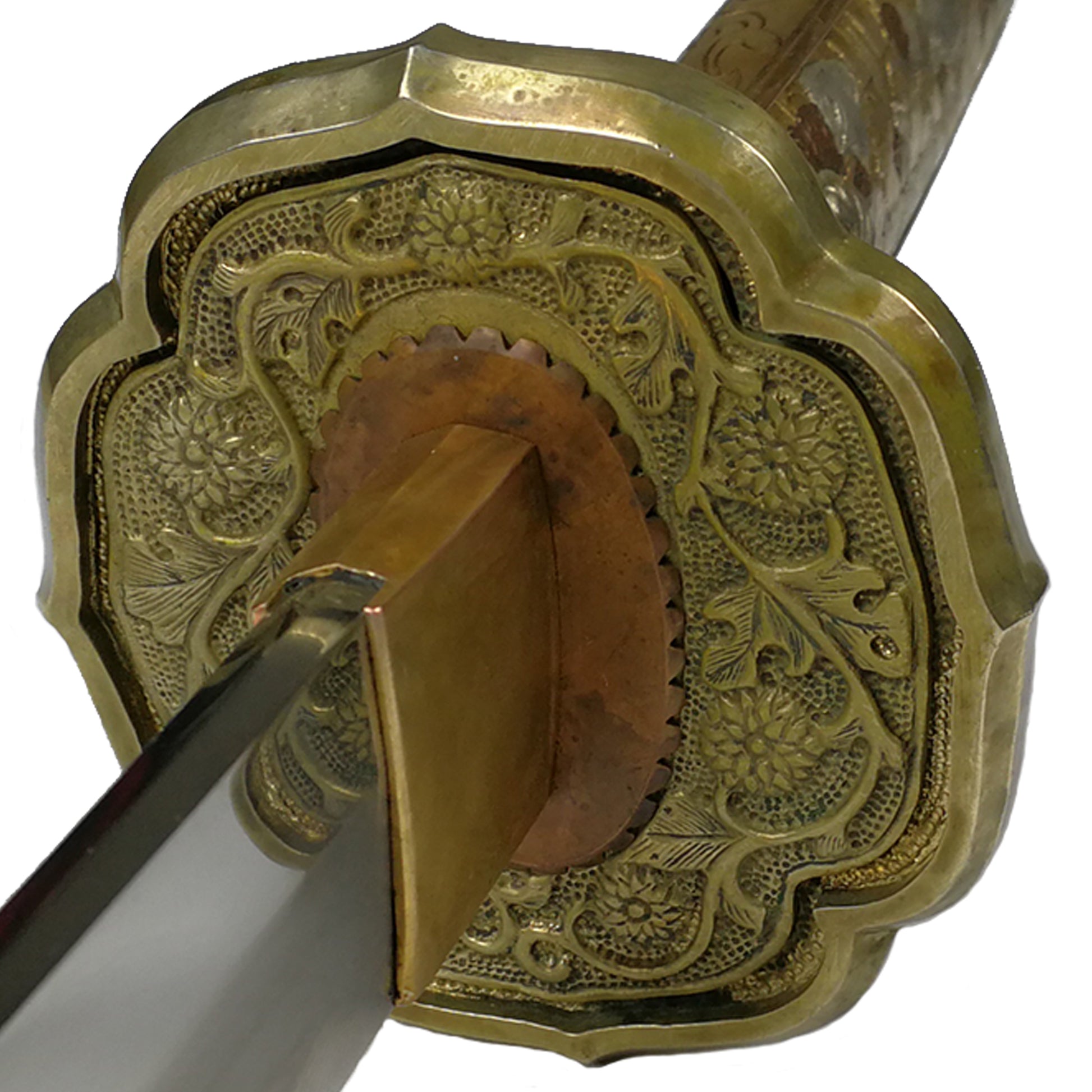 Delicately hand-etched into the copper handle and saya is the depiction of the story of Suikoden (Water Margin) making this sword truly a work of art. Delicately hand-engraved along this sword depicts the legendary tales inspired by this epic novel. The blade is hand forged from high carbon steel using traditional Japanese forging methods passed down from each generation to the next. The saya and handle is accented with genuine gold, silver, copper and bronze. The tale of Suikoden is painstakingly hand sculpted throughout this LIMITED EDITION Tachi.