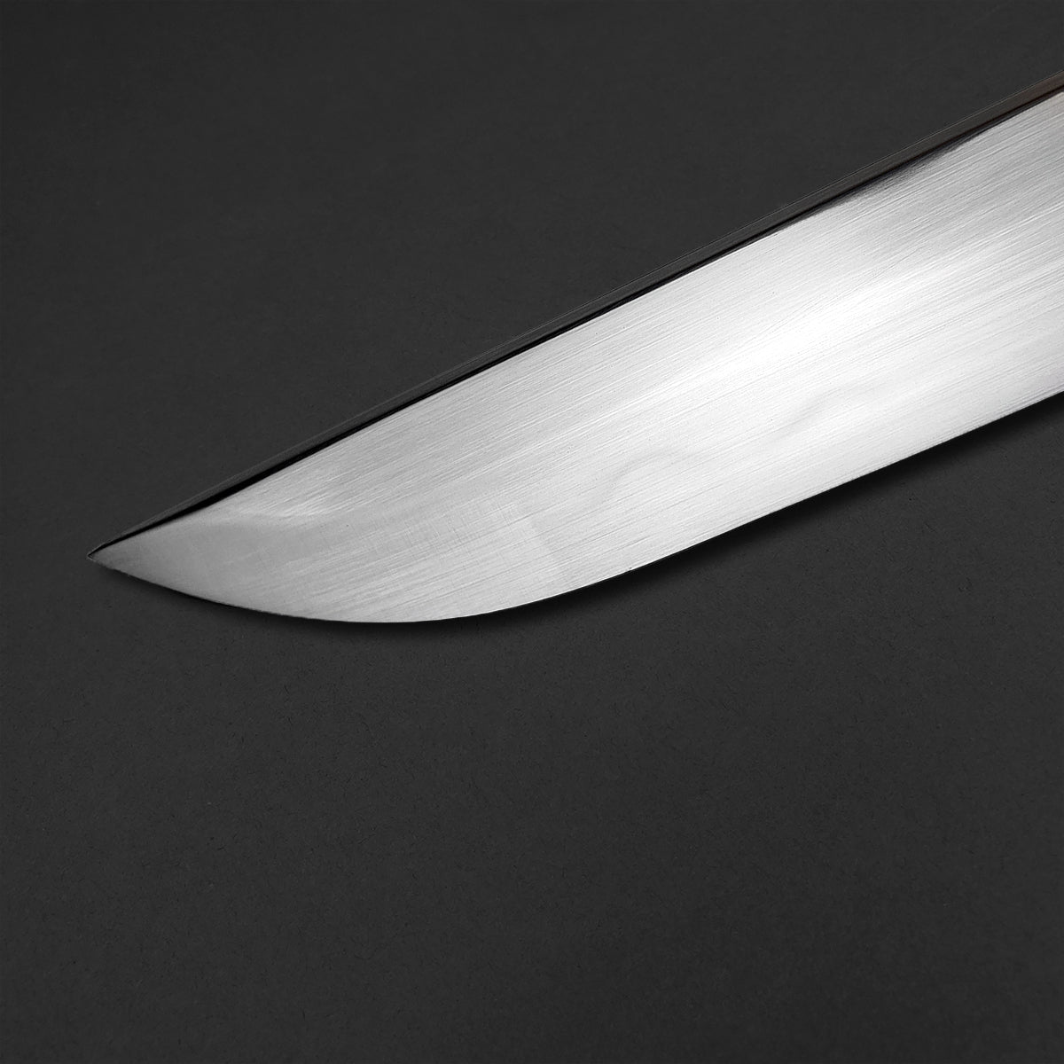 The wood handle is real ray skin wrapped in traditional black cotton cord. It also features brass Fuchi and Kashira.