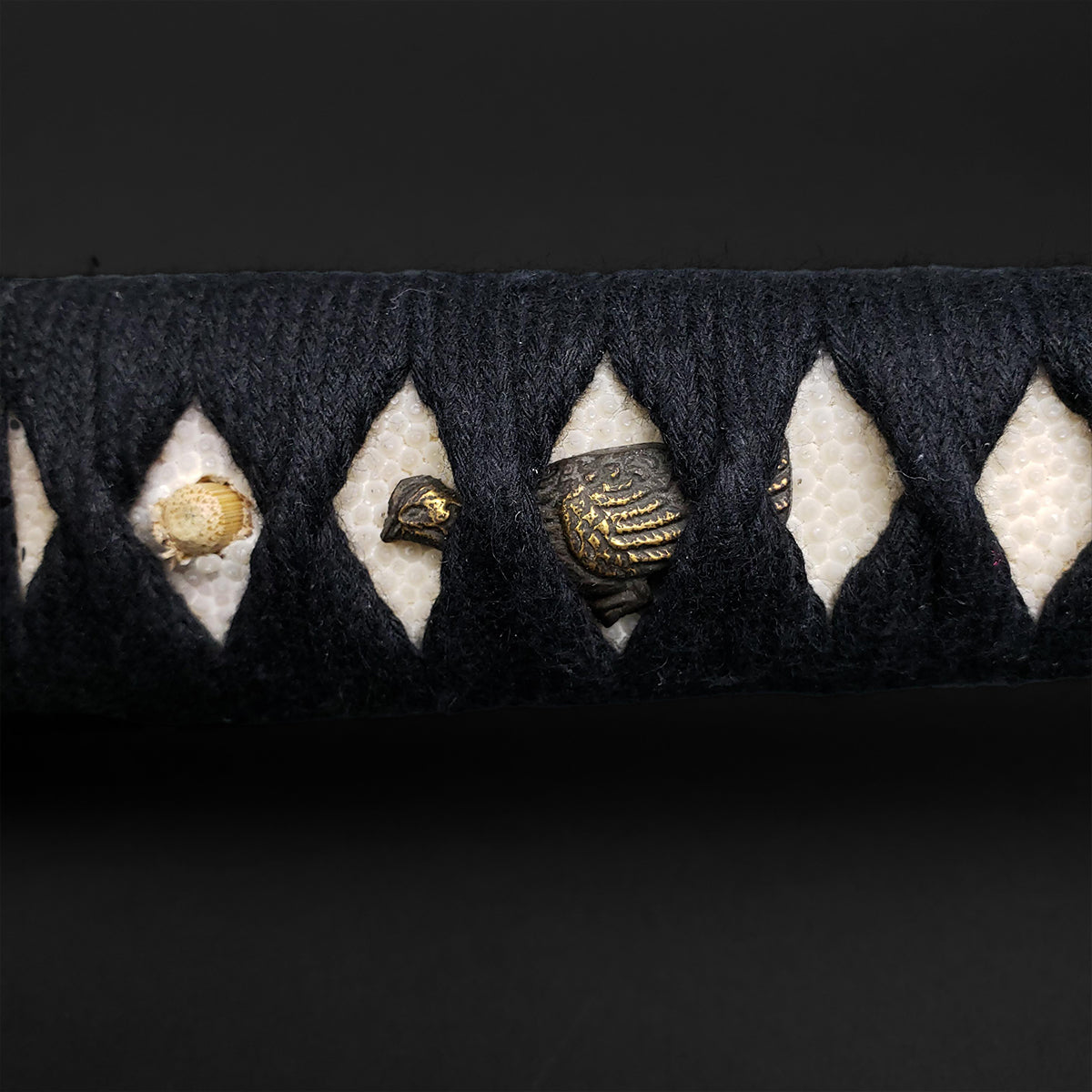 The detailed Maru Gata style brass tsuba depicts the pattern of the “Umi”, or ocean. One side of the tsuba shows a calm ocean with birds in the sky, while the other side of the tsuba shows how dangerous oceans can be with aggressive tidal waves pounding away. Such is the way of the Samurai. In time of peace they are calm and collected, but when war erupts, they are fierce and formidable.