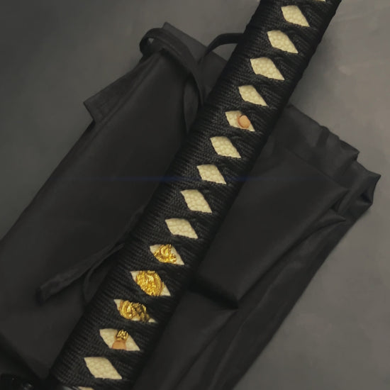 This blade features beautiful patterns of the five elements in black and gold with the wood of handle making this katana a unique and wonderful design. Bo-Hi is commonly known as blood grooves, but that is a common misconception. The katana is lighter than usual and enables the user to wield the katana better and put less stress on the hands. Not to mention it benefits some advance cutting techniques that require the katana to change direction rapidly.