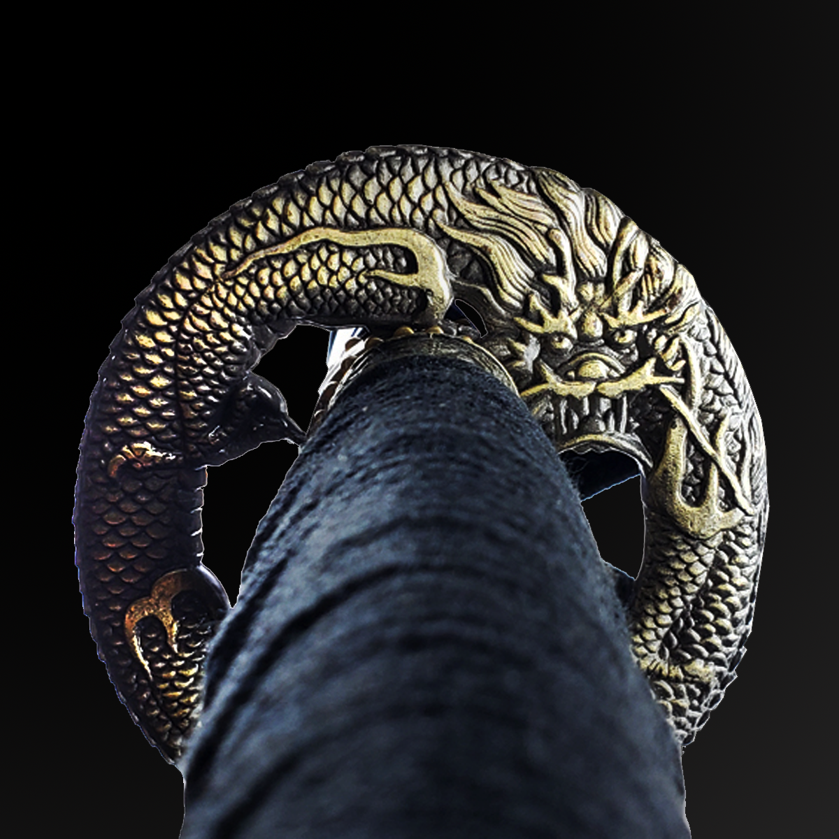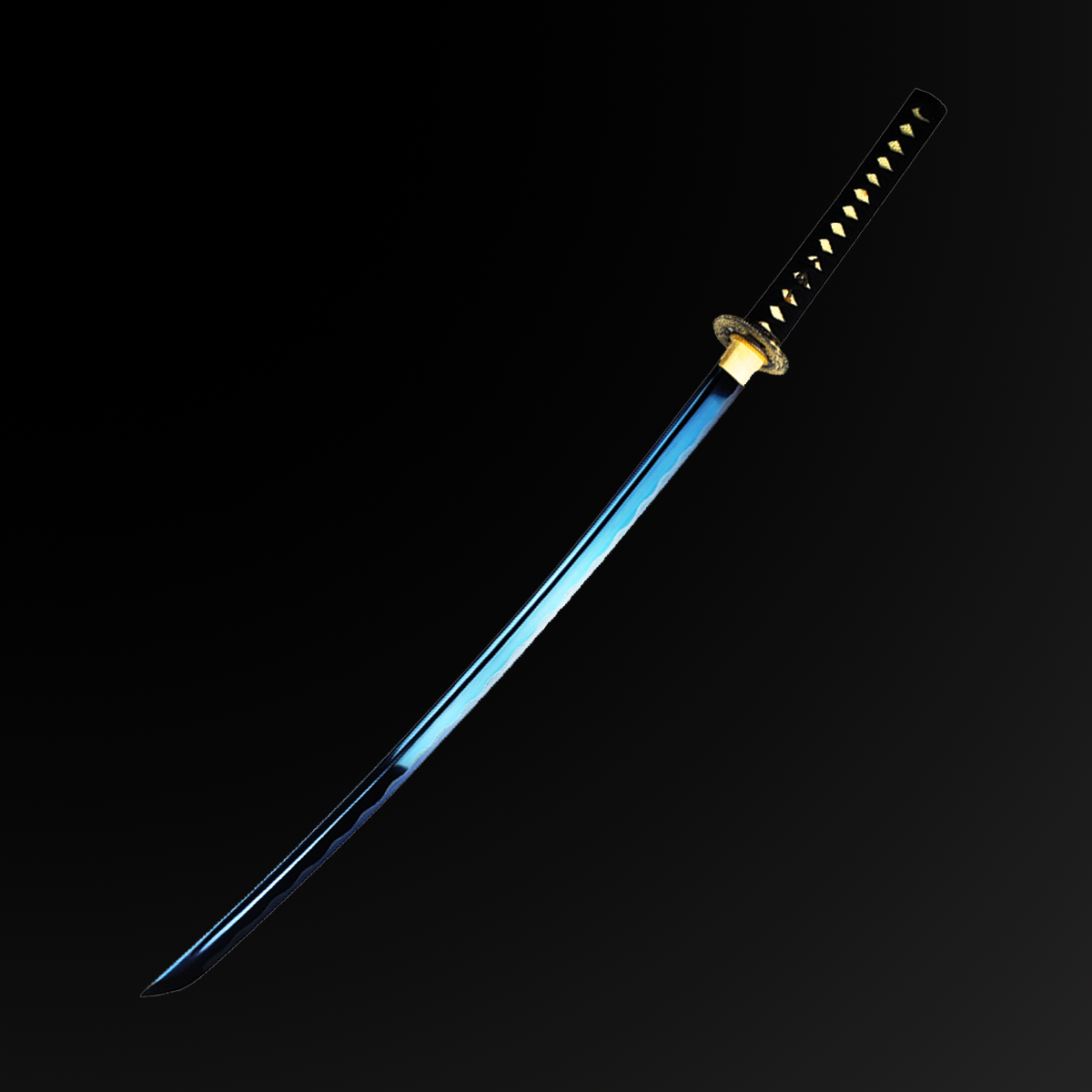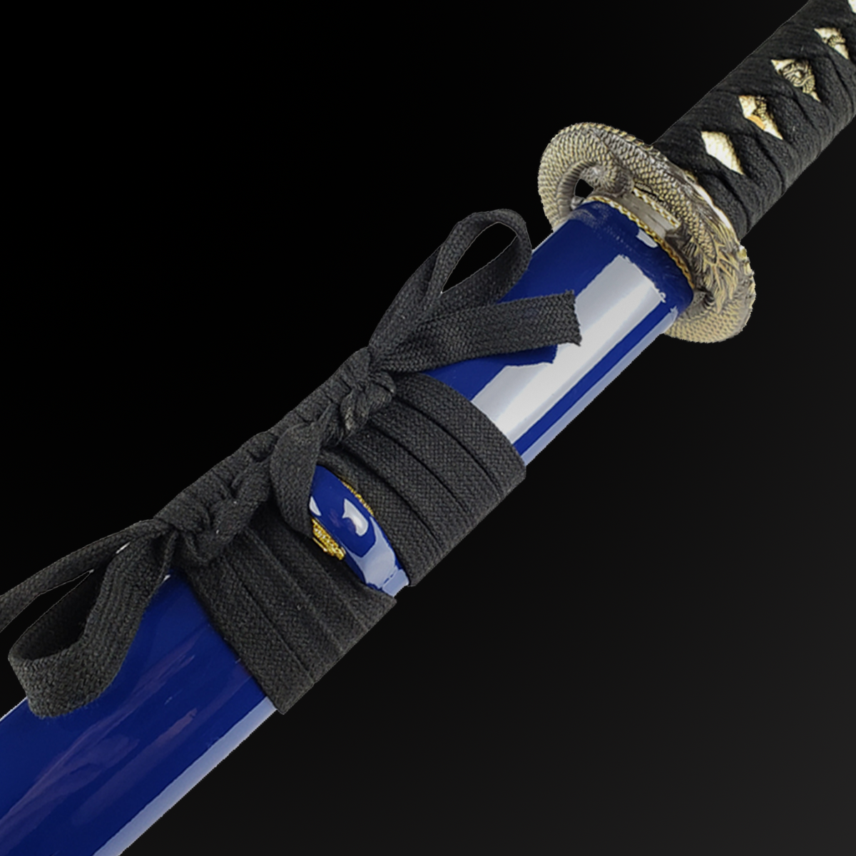 Blue color themed katana with Maru Gata style tsuba. The detail tsuba depicts the mythical water dragon Mizuchi as it surrounds the katana. In Japanese mythology the Mizuchi is perceived as a water deity who controls the fierce seas. Beautiful blue anodized pattern effect on the blade gives the katana a distinct and unique look.