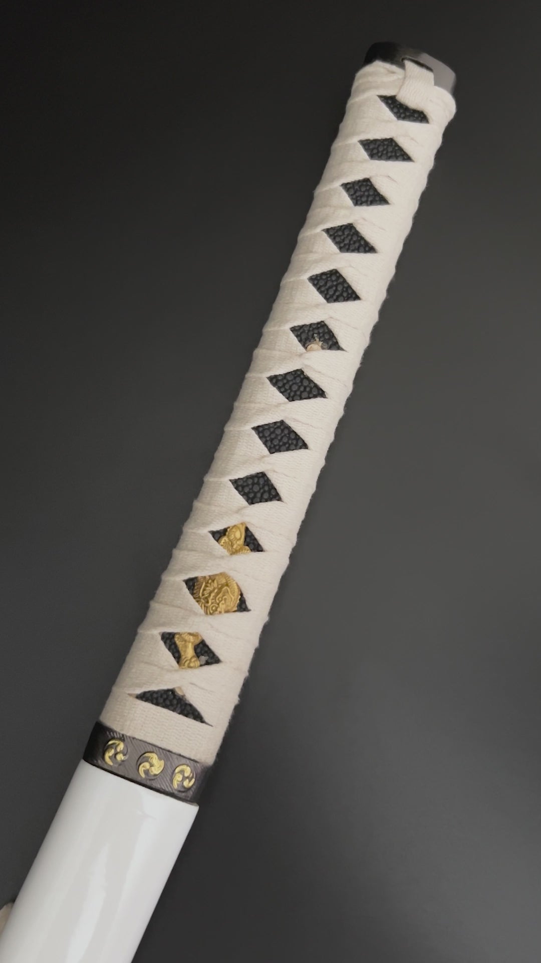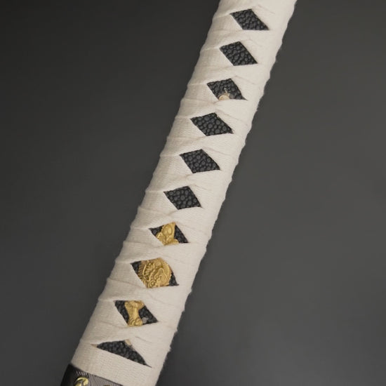 The detailed metal Fuchi and Kashira portrays the Asahina family crest. The Asahina family was a Japanese clan during the Sengoku period who were known to be fierce warriors who were feared by all their enemies.